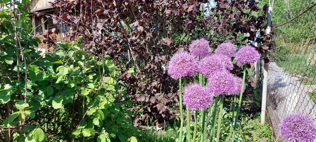 А здесь лук рассажен мужем вдоль сетчатого забора и он не поливается, но зато и головки его приобрели более насыщенный розовый цвет. Вот так мы постепенно и разводим на даче растения, помогающие идее непрерывно цветущего природного сада.