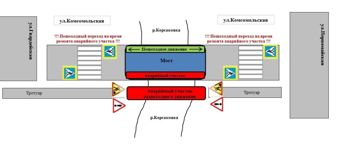 🖐👉👆 В связи с проведением ремонтных работ мостовового перехода через реку Корсаковка движение для пешеходов осуществляется по одной стороне улицы Комсомольской. 🟢Для удобства граждан организованы временные пешеходные переходы через дорогу. Будьте внимательны!