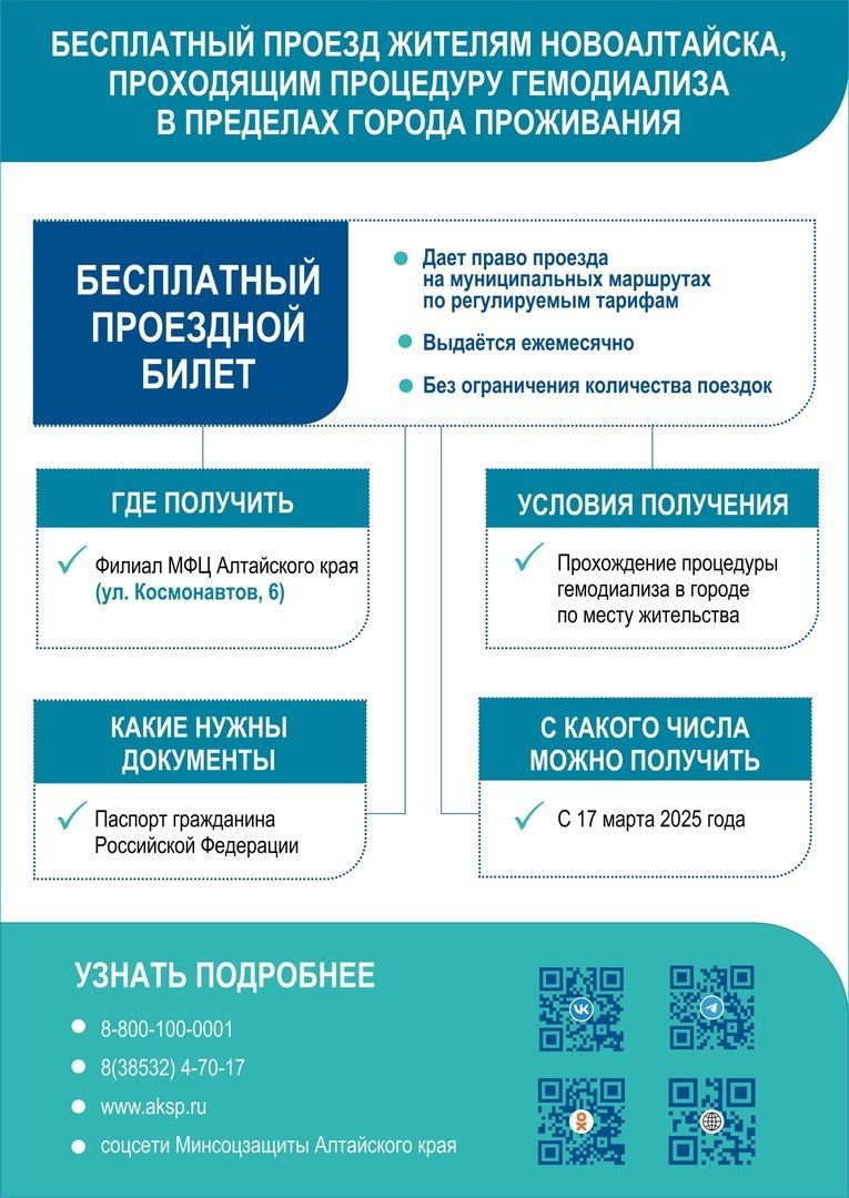 ⚡С апреля 2025 года жителям шести городов Алтайского края, проходящим гемодиализ в городе их проживания, предоставляется бесплатный проезд в общественном транспорте 📍По инициативе Губернатора Алтайского края В.П. Томенко гражданам, проходящим процедуру гемодиализа, в пределах населенного пункта их проживания с 1 апреля предоставлено право на бесплатный проезд на общественном транспорте без ограничения количества поездок. 👉Где получить бумажный проездной билет - смотрите в карточках 🙌Кроме того, гражданам, направленным для прохождения гемодиализа и проживающим в населенных пунктах, где нет диализных центров, органами социальной защиты населения ежемесячно предоставляется компенсация стоимости проезда. С 1 марта стоимость поездки составляет от 750 до 3750 рублей. #Алтайскийкрай #Минсоцзащита_22 #Гемодиализ