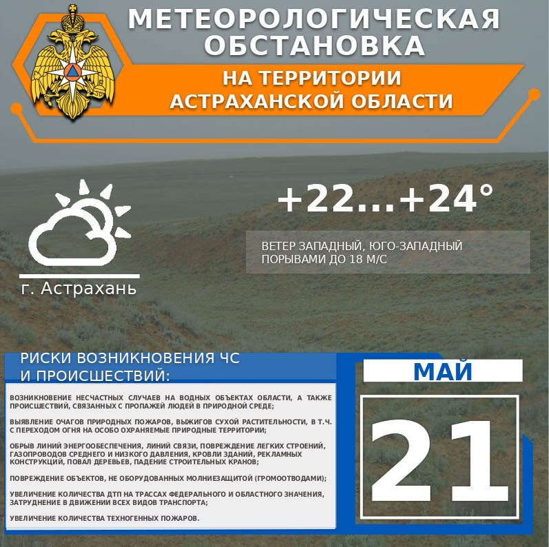 🌼Метеорологическая обстановка на 21 мая 🌤На территории области переменная облачность. ☔️Местами кратковременный дождь, гроза, пыльная буря. 🌬Ветер западный, юго-западный порывами 15-20 м/с. 🌡Температура воздуха +20...+25°, по северу +14...+19°. ☁️По г. Астрахани небольшая облачность. Без существенных осадков. 🌬Ветер западный, юго-западный порывами до 18 м/с. 🌡Температура воздуха +22...+24°.