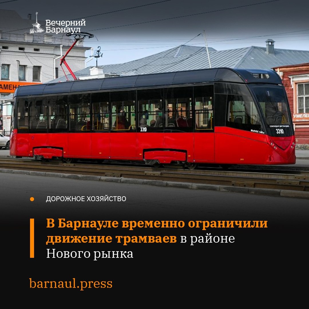 В Барнауле из-за технической неисправности ограничили движение трамваев в районе Нового рынка. Сейчас на месте работает аварийная бригада. Трамваи ходят следующим образом: 🔸 Маршрут №4: депо №1 — улица Анатолия — проспект Красноармейский — площадь Свободы, назад так же. 🔸 Маршрут №1: площадь Свободы — проспект Красноармейский — улица Анатолия — улица Челюскинцев — улица Антона Петрова — улица Северо-Западная — проспект Калинина — проспект Космонавтов — улица Попова — Докучаево, назад по маршруту. 🔸 Маршрут № 7: Кордон — проспект Красноармейский — улица Анатолия — улица Челюскинцев — улица Антона Петрова — далее по маршруту до депо №3, в обратном направлении по маршруту. @barnaul