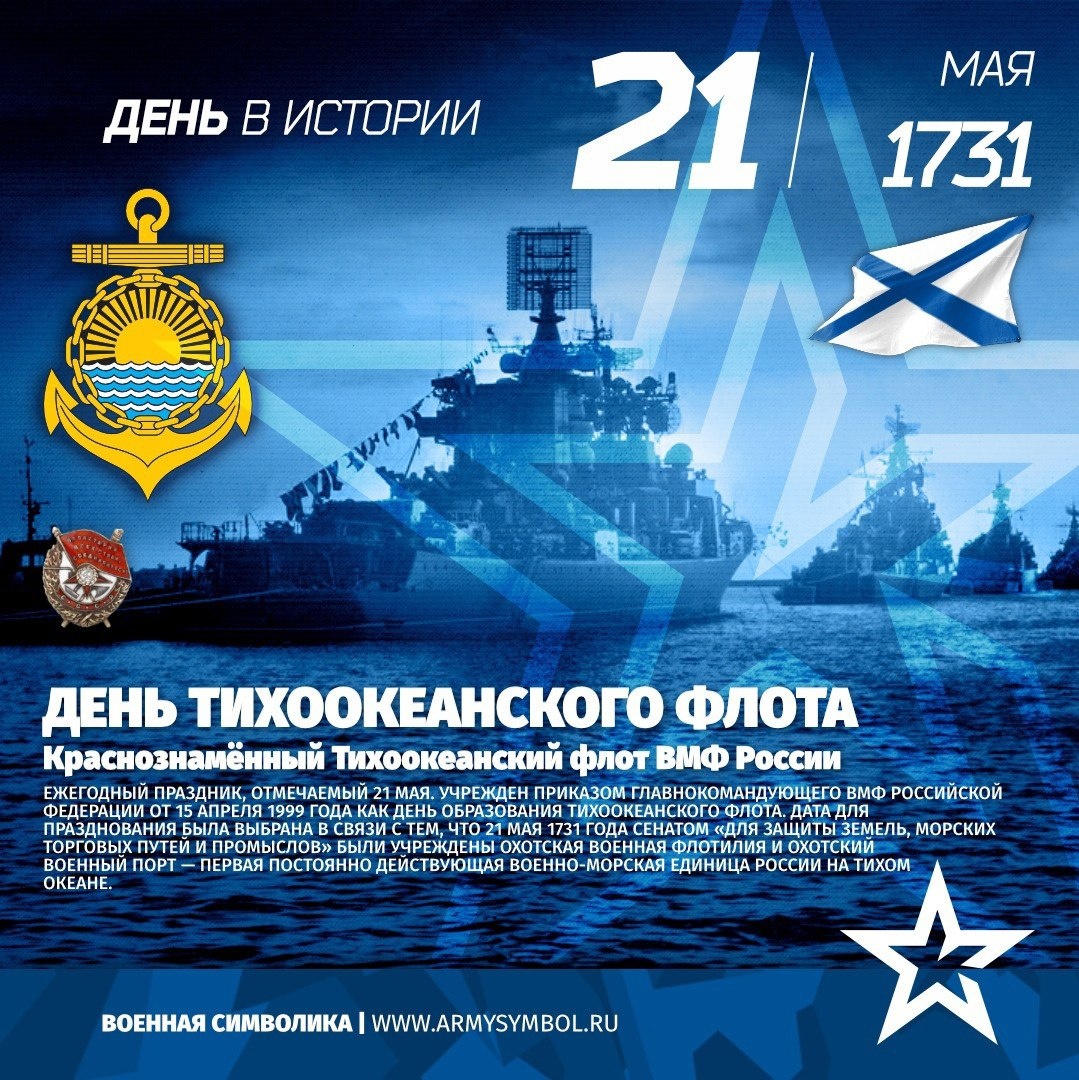 День Тихоокеанского флота Ежегодный праздник, отмечаемый 21 мая. Учрежден приказом главнокомандующего ВМФ Российской Федерации от 15 апреля 1999 года как День образования Тихоокеанского флота. Дата для празднования была выбрана в связи с тем, что 21 мая 1731 года Сенатом «Для защиты земель, морских торговых путей и промыслов» были учреждены Охотская военная флотилия и Охотский военный порт — первая постоянно действующая военно-морская единица России на Тихом океане. Еще во времена правления Анны Иоанновны с дальневосточных рубежей России в столицу стали поступать сведения о происходящих там частых нападениях японцев, китайцев и маньчжуров. Для защиты русских земель, морских торговых путей и промыслов российские дальневосточники вынуждены были строить корабли и суда, размещая их при военных портах. Именно основываясь на данных сообщениях и был издан Указ Сената об учреждении Охотско Показать полностью... Подпишитесь на наши группы ВКонтакте и в Одноклассниках - читайте, смотрите и к