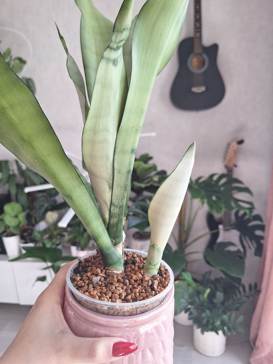 Бэби-бум у сансевиерий👶 Первая санса появилась у меня 2 года назад. Это лауренти (3 фото). С ней мы пережили огонь, воду и медные трубы. Она падала с подоконника, на неё сваливались рулонные шторы, в первый год она потеряла все корни, потому что я не умела за ней ухаживать. За это время я пересаживала её раза 3, потому что не могла подобрать оптимальное жилище. В начале этой весны перевалила её в керамический горшок, чтобы он мог держать её вес, и вот на днях у неё показалась первая детка🥰 Сансевиерии нужно редко поливать - даже маленькие экземпляры не нужно поливать чаще 1 раза в неделю, а моих я поливаю примерно раз в 2-3 недели в зависимости от сезона. Сейчас дома прохладно, грунт просыхает медленно, стоят они все не у окон. Кстати, важный нюанс о сансевиериях. Это теневыносливые, но светолюбивые растения. В целом они могут какое-то время расти в ограниченном количестве, но вам все равно нужно периодически недели на 2 ставить её на свет. Но прямые лучи она, кстати, не особо лю