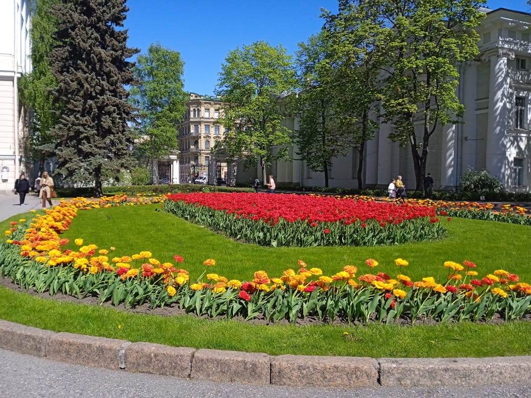 Всем привет. Друзья, спасибо большое за поздравления, но день рождения у меня 23 мая. Я немного поторопилась рассказать про подарки. Ездила в музей Фаберже, но о нем расскажу позже. Сделала очень много фотографий, которые надо разобрать, скомпоновать и рассортировать, а на это нужно время. Расскажу, что я видела и где была, после того как ушла из музея. Рассказ начну с конца, так тоже можно. По набережной Фонтанки я вышла на Невский проспект и пошла в сад Аничкова дворца. Мне захотелось присмотреть, какие там клумбы и цветы на них. У самого дворца большая клумба с тюльпанами. В этом году очень много пионовидных тюльпанов, их часто в городе встречаю. Для вас сняла маленькое видео. Ссылку на него прикреплю в конце статьи. Полюбовавшись на тюльпаны, пошла в сад Аничкова дворца, а в саду уже расцвел один рододендрон, и опять на клумбах пионовидные тюльпаны. Дошла до куста сирени, он еще только-только начал распускаться, но все равно очень красивый. Сделала фотографию поближе, но