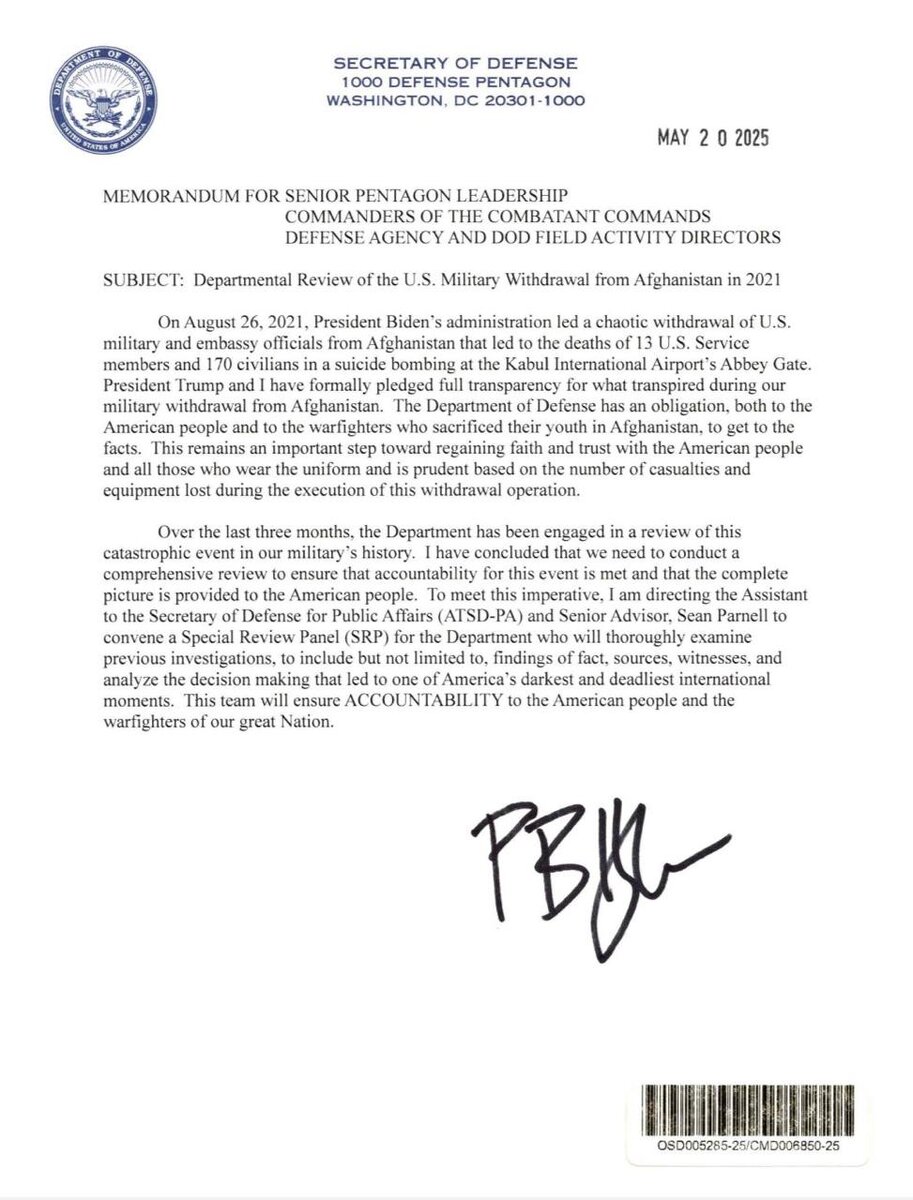 AQSH mudofaa vaziri Afgʻonistondan Amerika qoʻshinlari olib chiqilishini tekshirishni buyurdi Pentagon ma’lumotlariga ko‘ra, Bayden ma’muriyati boshchiligidagi qo‘shinlarning olib chiqilishi tartibsiz o‘tgan. Fojiali oqibatlardan biri 2021-yil 26-avgust kuni Kobul aeroporti yaqinida sodir etilgan terakt bo‘lib, unda 13 nafar amerikalik harbiy va 170 nafar fuqaro halok bo‘lgan. @daryolive