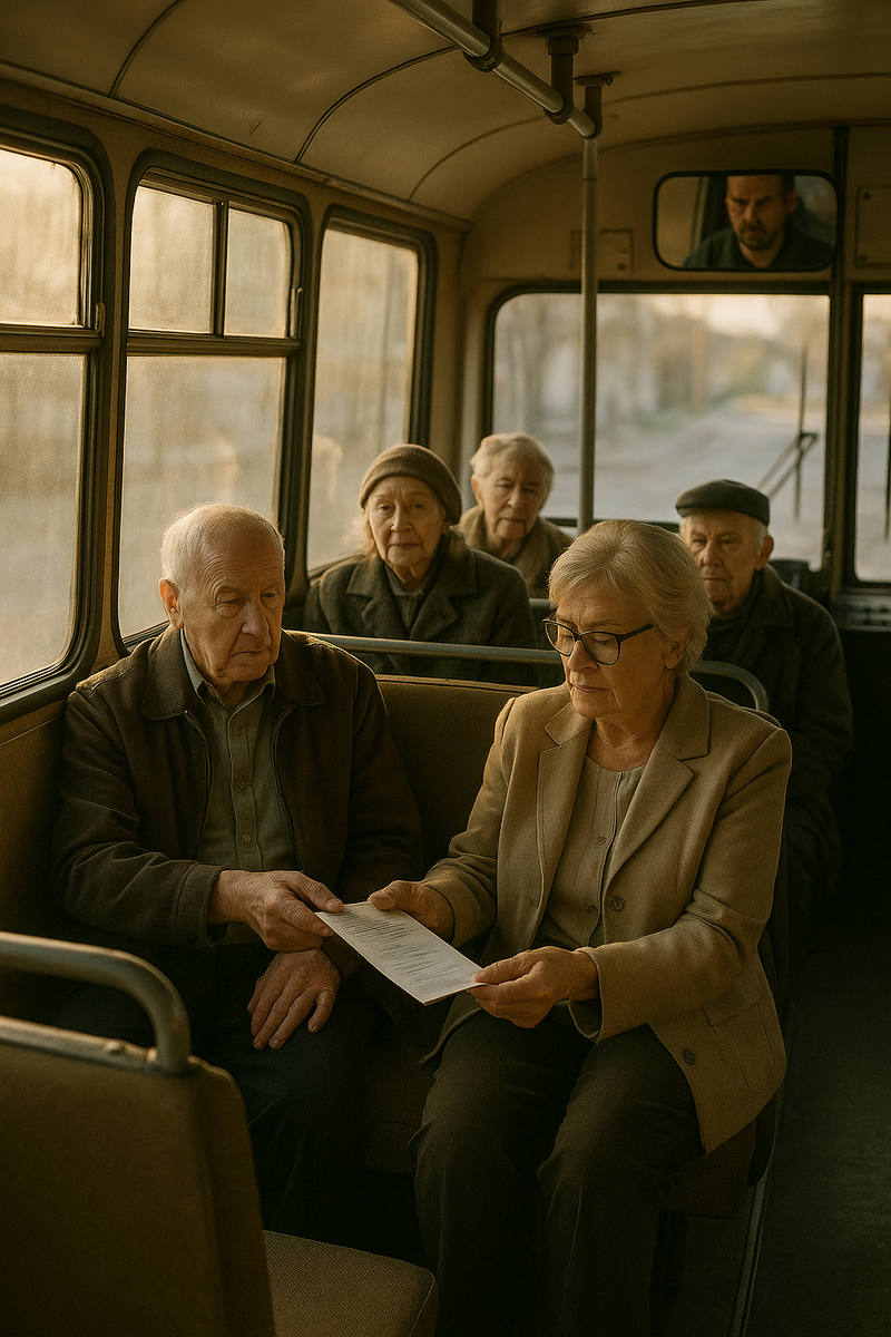 В тот вечер, высадив редких пассажиров, он заметил: из окна второго этажа дома кто-то смотрит. Женщина с белоснежной косой, лицо бледное, неподвижное. Она пыталась поднять руку, но рука повисла, как сломанное перо. А в салоне пенсионеры встрепенулись.