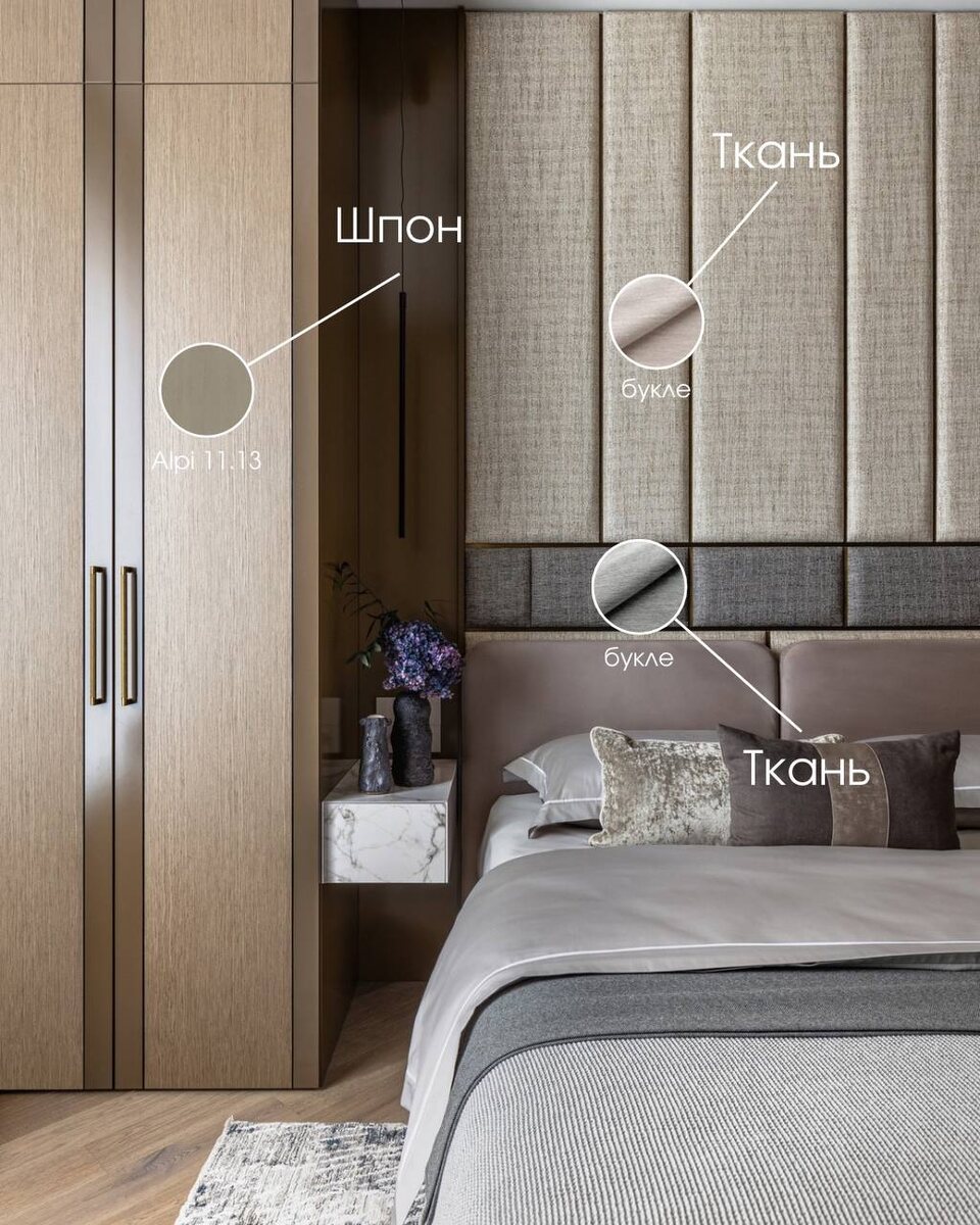 В спальне в ЖК «Сити Парк» мы установили панели из двух материалов — шпона и ткани. В этом проекте природная элегантность дерева встречается с мягкой роскошью текстиля. Боковые панели выполнены из МДФ с благородным шпоном Alpi 11.13 (радиал). Тонировка подчеркивает глубину древесного рисунка. Акцентные латунные вставки и деликатные русты придают интерьеру нотки изысканности. Текстильные панели выполнены из МДФ, обтянутого тканью букле в двух оттенках.