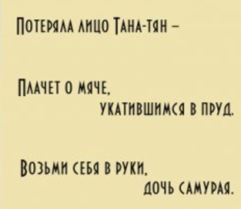 Валяется на полу Мишка-сан, Злые люди оторвали лапу, Тяжёлая судьба. Качаясь, шагает бычок, Глубоко вздыхает, Короток путь, кончается доска. 🐂 🐂 🐂 Одинокий зайка на скамейке, Брошен, вымок до нитки весь, Жестокое сердце у хозяйки. 🌸 🌸 🌸 Качается на рельсах вагон, Голубой, как небо, Голубые пассажиры внутри. 🚞 🚞 🚞 Шагают по лужам гейши, Мимо дома самурая идут они, Стар стал самурай, грустный день. 🚁 🚁 🚁 Живёт гяру в большой минке, Скрыта от взора моего, В дверь-сёдзи никому не войти. 🏯 🏯 🏯 Что ты, сакура, качаешься? Ветер гнёт до земли ветки твои. Видно одинокой судьба быть. 🌸 🌸 🌸 Если бы было золота с гору Фудзияма, И саке лилось рекой, Отдал бы всё за один лишь взор Любимой гяру. ⛰️ ⛰️ ⛰️ Будем невозмутимы, Как учит мудрость Дзена. Хейтерам вернётся вся мерзость их.
