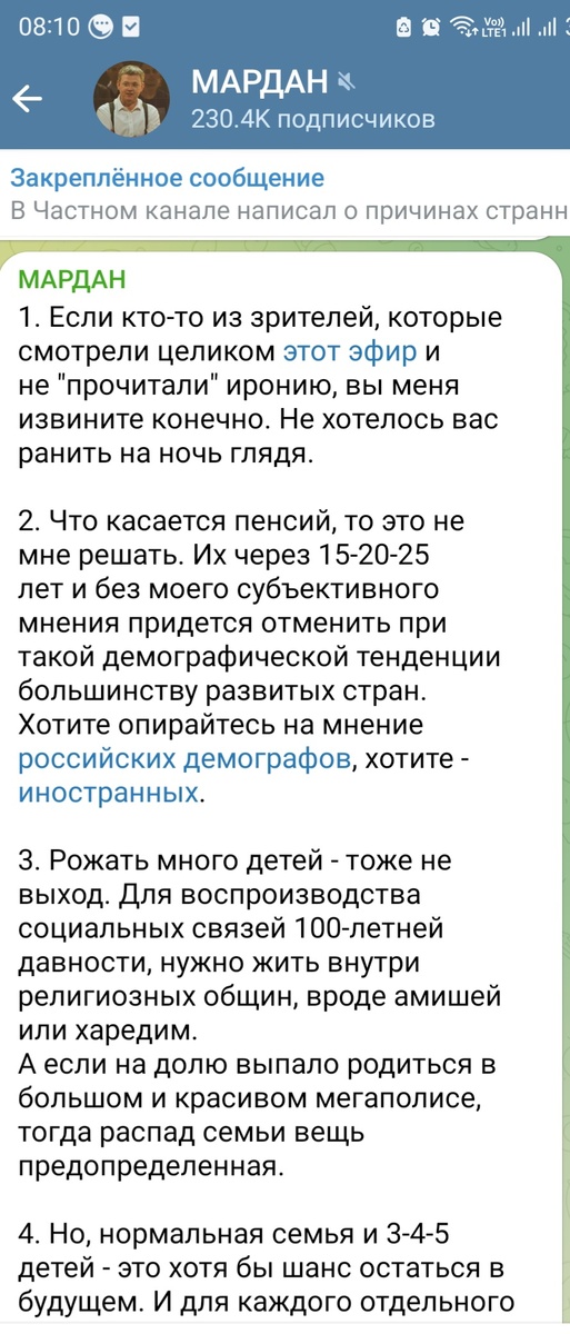 Ведущий канала «Соловьев.Live» Сергей Мардан выступил за отмену пенсий в России, чтобы те, кто не удосужился или не смог родить в молодости детей, скончались от голода. Лексика и стилистика журналиста сохранены. «Я раз за разом предлагаю: давайте отменим к чертовой матери пенсии. Вот нарожал себе, воспитал детей – значит, будет тебе, что в старости есть. Нет – сдохнешь», — глубокомысленно отметил Мардан. Очень глубокая мысль, рассчитвнная на маргинальную аудиторию: нет накоплений, нет ресурса, нет интеллекта, нет эмпатии. Пррнзительная мысль для бесчинствующего невежества. Этим высказыванием очерчена и аудитория канала. Эта аудитория должна думать, что пенсии - это не отчисления конкретной персоны в пенсионный социальный фонд (сколько денег потеряно при реорганизации?), а некая благостыня государева. Хочу пожалую, а захочу, так и отберу. При этом, тот, кто не "родил" (зачал, выносил, оплодотворил...) детей ,напротив, услугами и деньгами фонда и не только пользовался меньше: листки н