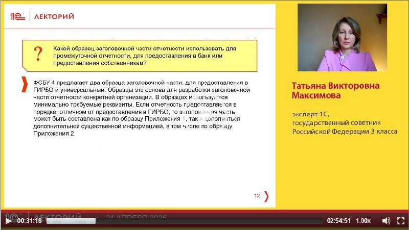 ❓Какой образец заголовочной части отчетности использовать для промежуточной отчетности, для предоставления в банк или предоставления собственникам? на этот и другие вопросы ответила Татьяна Максимова, государственный советник 3 класса, эксперт фирмы 1С в лекции на тему ФСБУ 4/2023 "Бухгалтерская отчетность", поддержка в 1С Отзыв слушателя: Лекторы-профессионалы, оперативно и доброжелательно отвечают на вопросы 👉 Смотрите бесплатно полную видеозапись лекции! 🚨Подписывайтесь на @lector_1c