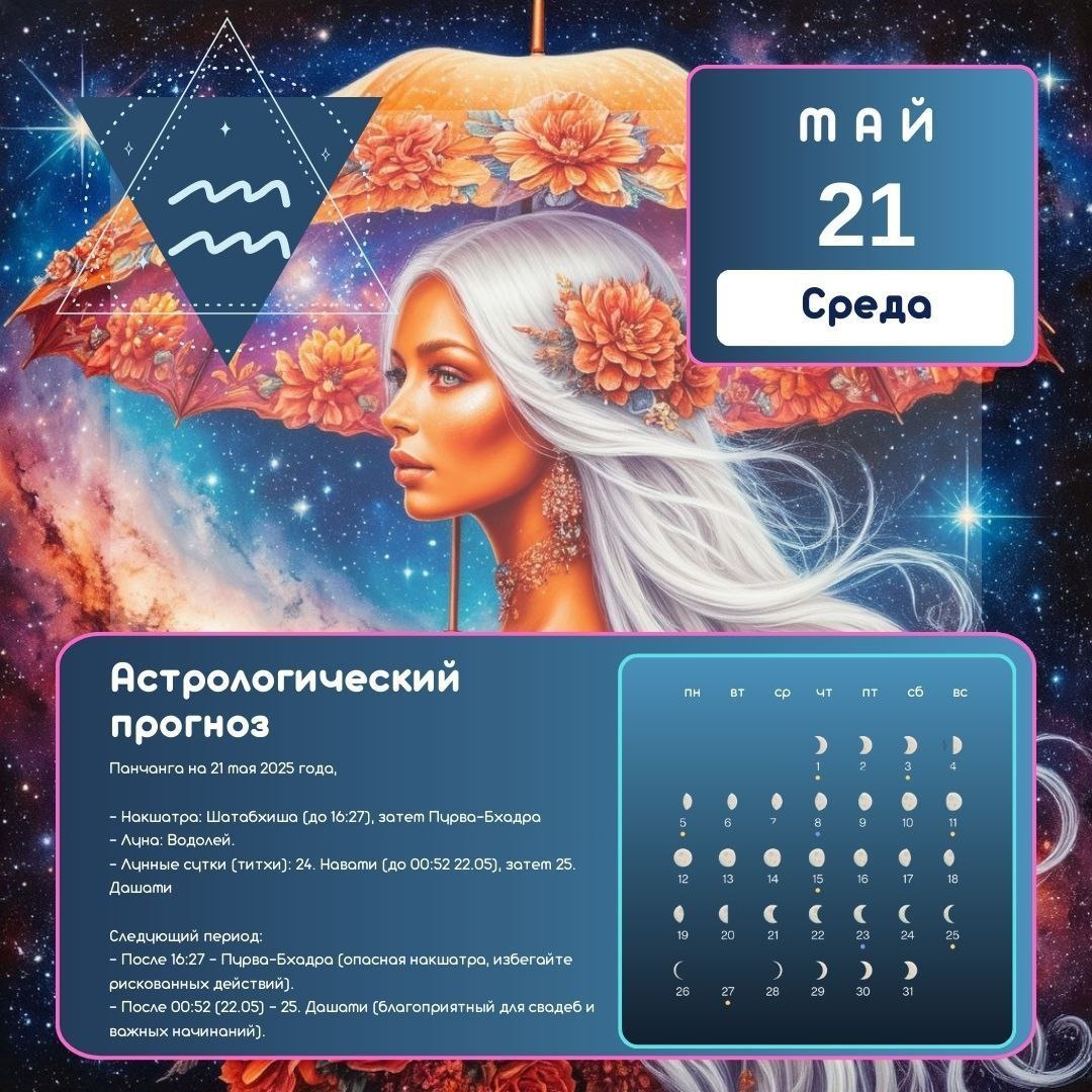 Астрологический прогноз на 21 мая: День Меркурия под знаком трансформации Среда, 21 мая — день, где энергии Меркурия, Луны в Водолее и огненной Криттики (Меркурий сегодня в ней) создают уникальный коктейль возможностей и испытаний. Готовьтесь к резким поворотам, но помните: каждая сложность — шанс для роста. Космический пазл дня - Луна в Водолее (24-е лунные сутки) — время для революционных идей и освобождения от прошлого. - Меркурий входит в Криттику — ум вспыхивает критичностью, но и творческой искрой. Осторожно с резкими суждениями! - Адхам йога (комбинация среды + 9-е лунные сутки) — энергия двойственности: рост через завершение старого. Временные порталы и их энергии 1. До 13:43 — Таитила карана - Символ: "Лотос" — время мягкого старта. Подходит для духовных практик и планирования. - Совет: Напишите список целей, но не начинайте действовать — дождитесь других энергий. 2. 13:43 — Гариджа карана + Шатабхишадж накшатра - Гариджа ("Гроза") — период силы, но и конфликтов. - Шатабхи