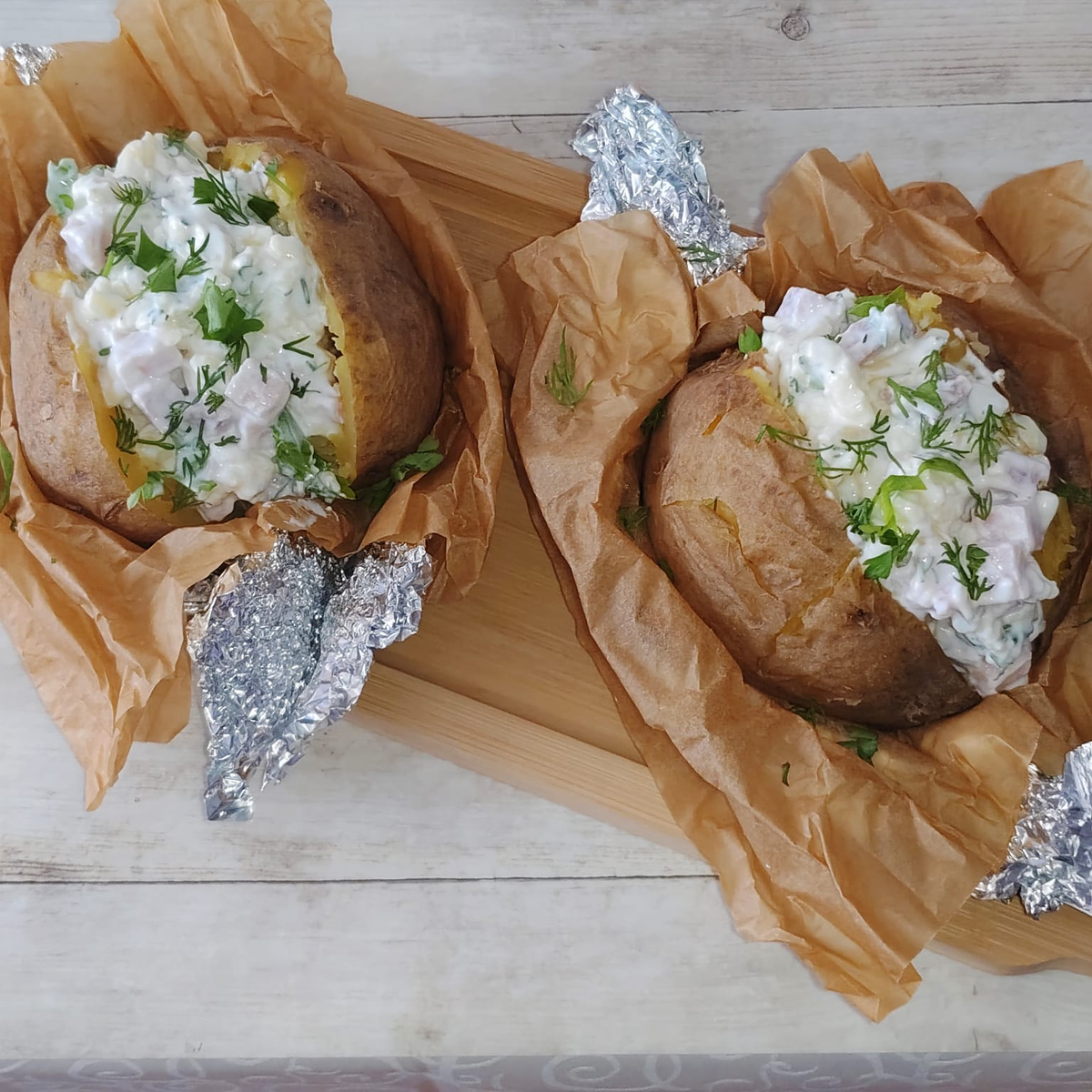 Готовый картофель достать, аккуратно развернуть. От "упаковки" не спешим избавляться, она может послужить тарелочками )