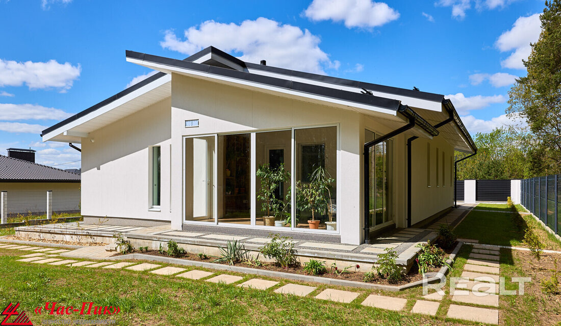 25 километров от МКАД, 15 минут до метро «Каменная Горка», коттеджный поселок. Здесь продается новый дом с чистовой отделкой и мебелью – можно заезжать и жить. Стоит недешево, но в его оснащении нет ничего копеечного: фальцевая кровля, окна в пол, серьезно утепленный фасад, печь-камин, автоматизация отопления, дорогая сантехника. А еще теплый гараж и отдельный хозблок, благоустроенный участок и настоящий лес с двух сторон. Вот подробности. Коттеджный поселок находится в новой части деревни Бузуны – с подъездными путями по асфальтированным дорогам, окружен лесным массивом. Транспортное сообщение с Минском хорошее – ходит городской автобус и маршрутка. Развитая инфраструктура в соседнем Ракове. Дом здесь энергоэффективный, построен в 2024 году по индивидуальному архитектурному дизайн-проекту. Фундамент монолитный железобетонный с утеплением и гидроизоляцией. Стены блочные, утеплены каменной ватой (12 см). Фасад отделан качественной декоративной штукатуркой. Кровля фальцевая, с утеплением