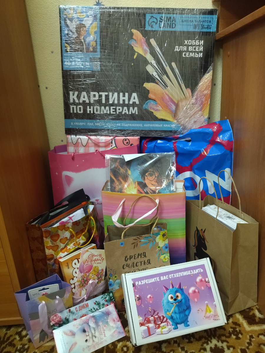 Приветствую всех заглянувших ко мне на канал 👋 У моей дочки не так давно был день рождения. Как отметили, куда ходили и во сколько это обошлось расскажу чуть позже. А пока остановлюсь более подробно на подарках. Всё расскажу и покажу, вдруг кому пригодятся варианты и идеи. Сразу скажу, подарков было много, но я покажу только самые на мой взгляд интересные. Набор сладостей. Эти наборы сейчас набирают популярность, их стоимость и содержимое варьируется в огромном диапазоне, что позволяет с лёгкостью выбрать подходящий вариант, опираясь на свой бюджет. Упаковка тоже разная, некоторые наборы просто в пакетах, другие в крафтовых коробках, наш набор вот в такой прикольной коробочке с монстриком. Все содержимое показывать не буду, вы можете посмотреть такие наборы на маркетплейсах. Картина по номерам. Огромный выбор изображений, на любой вкус и кошелек. Пейзажи, натюрморты, сказочные герои и даже фантастические сюжеты - найдется все! Моя дочка в последнее время увлеклась чтением книг и п