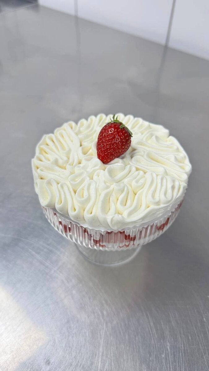 Сборка На дно креманки отсаживает часть крема, по кругу выкладываем клубнику срезом к стенке, затем кладем бисквит слегка придавливая его, отсаживаем еще часть крема и разраниваем его к стенкам фиксирую тем самым положение клубники, заливаем бисквит небольшим количеством пюре и снова отсаживаем крем выранивая всю поверхность креманки , насадкой делаем узор как на фото, украшаем клубникой.