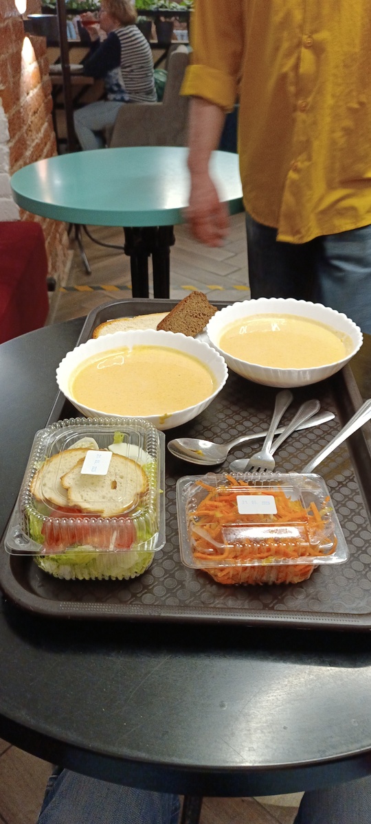 Вот и начался мой день рождения ,в начале мы пошли в наше любимое место Хотя в начале мы как обычно долго не могли состыковаться ,но наконец то это произошло!) Сырный суп просто зачёт!!Здесь при его наличии мы всегда берём !Но в этот раз он был почему то с морковкой!!)Сочетание не менее интересное! как обычно взял салат а-ля-Цезарь, ему почему то он там тоже нравится а мне выпендриваться не нужно и по этому салат из морковки с яблочком самое то!) И тут не плохо стартанули и двинули дальше ) Бейлис конечно как всегда на высоте и он очень скрасил долгую прогулку!!) Небо сегодня прекрасно и удивительно , наверное хмурится что не так, что то хочет мне сказать наверное! Может нагрешил!) Шурпа и салатик и лепешка, как будто в Средней Азии и так же вкусно! Шурпа кстати с говядиной и очень мягкой !!Баранину нам не посоветовали )).И кстати за все это за двоих 580 рублей!!) Ну а потом наши приключения продолжились ,при наличии одного курьеза ,так как сидели мы на фуд-корте ,то персонал со
