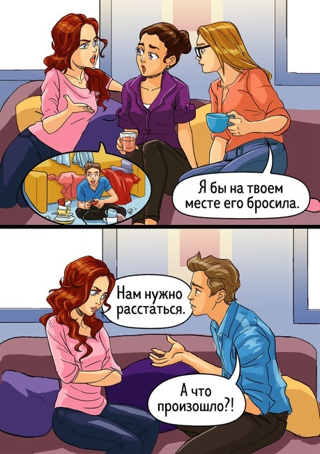 О женской дружбе много всякого сказано, написано, немало споров и сейчас ведётся об этом виде дружественного взаимодействия подруг. Но речь пойдёт не об этом, а о советах, которые так любят давать многие представительницы прекрасной половины человечества своим подругам, особенно когда последние испытывают какие-то трудности во взаимоотношениях со своими мужчинами. Следует заметить, что не обязательно каждая женщина из зависти или вредности даёт определённого рода советы – она может это делать, исходя из личного опыта, пытаясь «оградить» подругу от таких же, как ей кажется, ошибок. Предлагаю посмотреть довольно неплохие комиксы, в которых упомянуты именно такие ситуации, когда советы подруг «помогут» быстрее расстаться девушке со своим молодым человеком, а не наладить с ним нормальные отношения. Думаю, многие женщины совершают непоправимую ошибку, когда, не зная как вернуть мир и покой в их отношения с мужчиной, они обращаются за советом к подругам, желая услышать их вердикт. Надо ли го