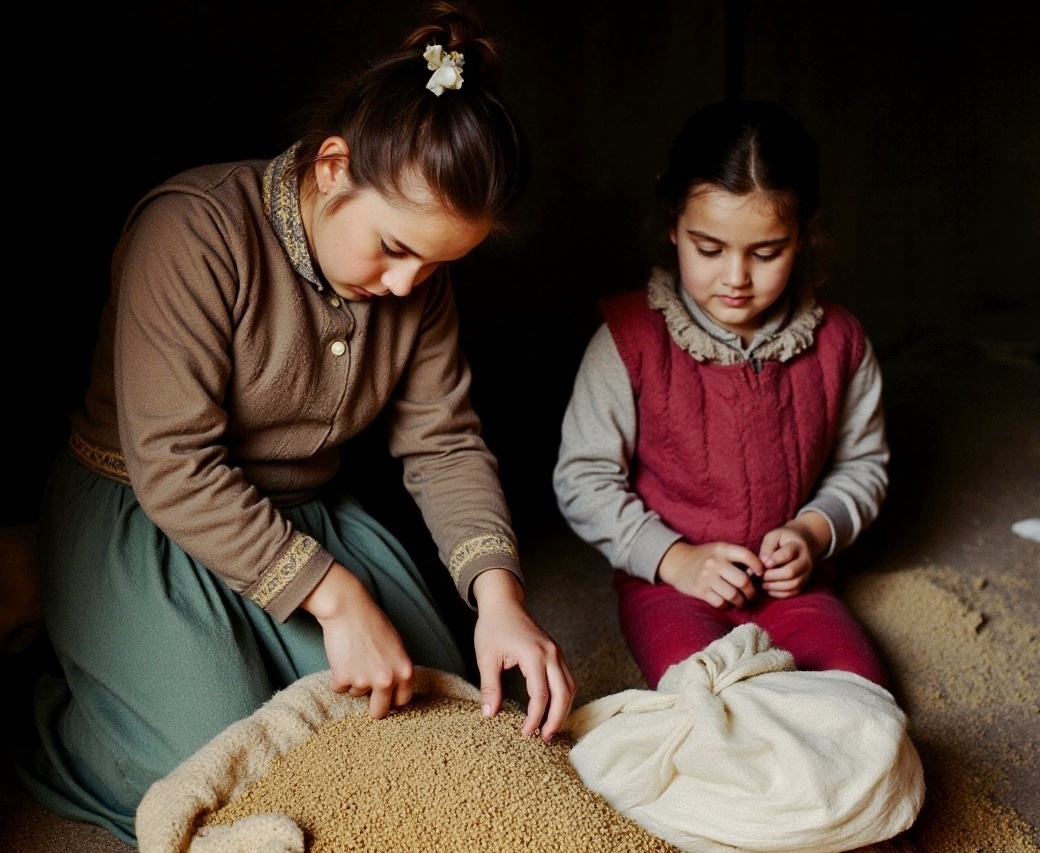 Уход за скотиной и сытная жизнь Пришел еще один вечер, похожий и на прошлые вечера. Сестры Файза и Гульшат, как всегда стали выносить на руках козлят и ягнят на вечернее кормление к их мамам. Потом одна из них стала убирать в мешок грязную, сырую подстилку для ягнят в загоне, специально отгороженном в правом углу передней комнаты; другая в отсутствие ягнят вымыла полы и постелила туда охапку сухого сена, принесенного с навеса в сарае. Дома запахло сухой травой-сеном. Для ягнят подвесили на веревочке сено из самых качественных трав, чтобы они учились есть сено, а не ждали, когда же наконец их вынесут из дома в сарай к их мамам, и чтобы раньше времени не блеяли, требуя кормления. Пока ягнята в сарае, в дом завели корову, которая недавно только отелилась, туда, где начинался ее хвост, были привязаны какие-то красные тоненькие плетеные в несколько косичек тряпочки. Вот мать вывела теленка, стоявшего тоже в загородке, подвела его к вымени коровы, и теленок жадно стал сосать сосок. Мать с тр