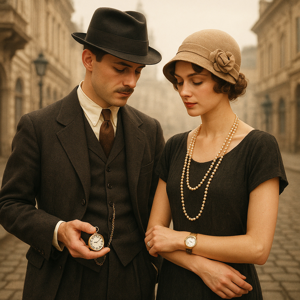 На улице — 1924 год. И всё, что знает о вас окружающий — это пальто, взгляд… и часы. Да, именно часы. Тогда это был не просто аксессуар. Это было заявление. Такие носили банковские клерки, старшие инженеры, железнодорожники. Вы были из тех, кто ценит порядок, уважает стабильность и держится ближе к традициям. Цепочка к жилету, серебристый корпус, возможно — выгравированные инициалы. Вы держите время в кармане. Потому что ваш день — как расписание поездов. В 1924-м наручные часы только начали входить в мужскую моду. Они уже не считались “дамским капризом”, но ещё вызывали вопросы. Значит, вы — из тех, кто не боится нового. Возможно, бывший офицер. Возможно, лётчик. Возможно, просто человек, который не любит лезть в карман, когда важно действовать быстро. Вы выбираете удобство — но без потери стиля. Для дам часы были скорее украшением, чем прибором. Их носили, чтобы под