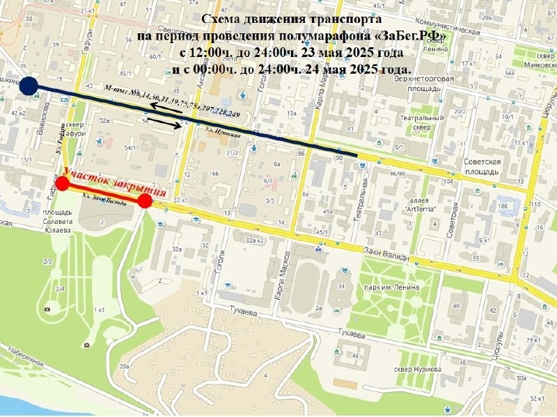 В Уфе в связи с проведением IX Всероссийского полумарафона «Забег.РФ» 24 мая перекроют движение транспорта. Ограничения будут действовать с 07.00 до 17.00 в центральной части города, сообщили в столичной мэрии. Улицы, которые перекроют, показаны на схеме. На время перекрытия не будут курсировать трамваи №№ 5, 16. Троллейбусный маршрут № 22 будет работать по измененной схеме движения: в сторону центра – Колхозный рынок, пр. Октября, ул. Шафиева, ул. Р. Зорге, бульвар Ибрагимова, ул. Пархоменко, ТК «Центральный». В обратную сторону: по ул. 50-летия Октября, пр. Октября, Колхозный рынок. Схема движения автобусных маршрутов также прилагается. Ранее стало известно, что в уфимском Сипайлово перекроют улицу.