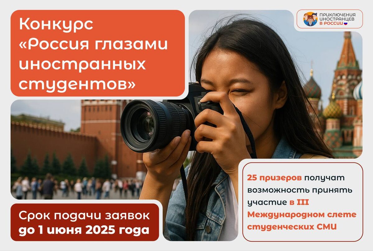 🚀 Проект «Приключения иностранцев в России» объявил конкурс «Россия глазами иностранных студентов», 25 призеров которого станут участниками III Международного слёта студенческих СМИ. Мероприятие пройдет с 1 по 5 июля 2025 года в Калужской области