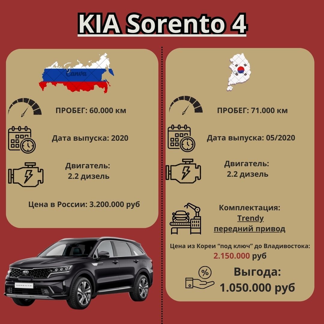 Сегодня в рубрике #Что_по_ценам? еще один народный любимец Авто – Kia Sorento (4 поколение, 2.2 дизель, комплектация Trendy). Сравниваем стоимость автомобиля в России и при заказе через нас из Южной Кореи. 🇷🇺 Рынок РФ - объявление 🔵 Год: 2020 🔵 Пробег: 60 000 км 🔵 Цена: 3 200 000 ₽ 🇰🇷 Прямая поставка из Кореи - объявление 🔵 Год: 05.2020 🔵 Пробег: 71 000 км 🔵 Цена "под ключ" до Владивостока: 2 150 000 ₽ ⚡️ Выгода: 1.050 000 ₽ Что входит в цену из Кореи: ✅ Сам автомобиль ✅Осмотр и переоформление ✅Логистика до Владивостока ✅ Таможенное оформление и утилизационный сбор 📦 Машина доступна к покупке уже сейчас. Если продана — найдём аналог с таким же пробегом и комплектацией. 📍 Доставим авто в любой регион РФ. Пишите мне: @src_manager
