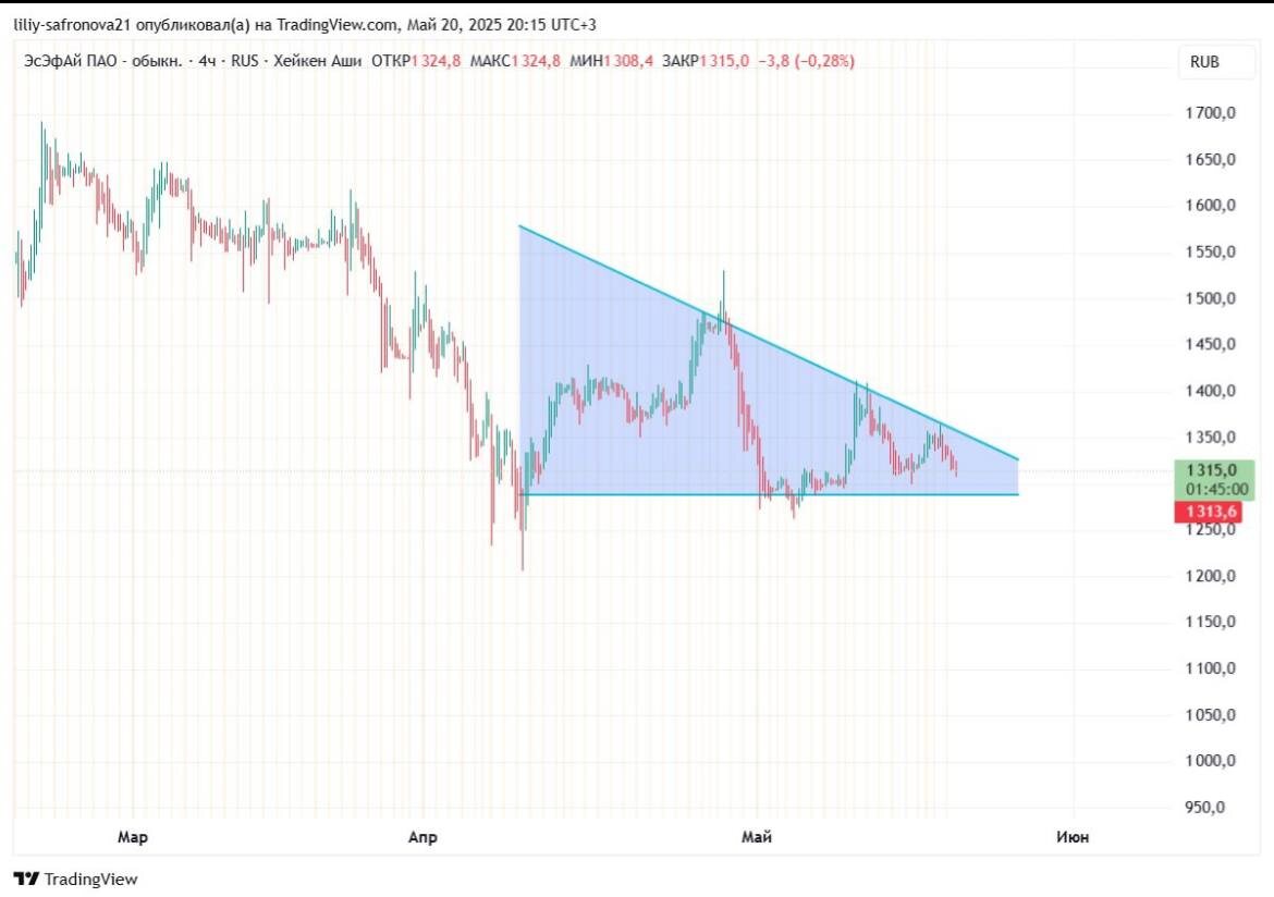 $SFIN 🕯В настоящее время актив достраивает фигуру треугольник с прямой стороной. Данная фигура пробивается вниз. При пробитии уровня поддержки на 1288,2 и закреплении под уровнем, начнется отработка фигуры. Вероятное падение цены до 1141,2 💡 Уровнем сопротивления будет 1484,2. При пробитии этого уровня фигура будет сломана и вариант отработки будет исключен! Не ИИР #теханализ #трейдер #инвестиции #SFIN