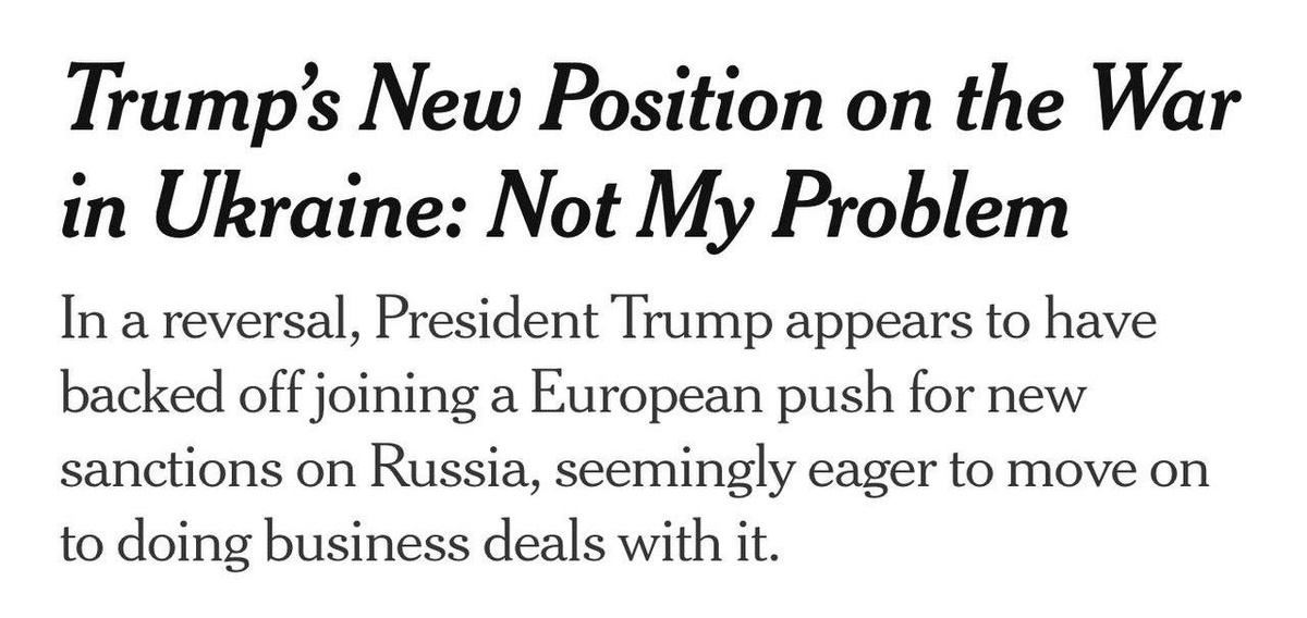 Приехали 😀 - «Это не моя проблема: Трамп заявил, что Украина и Россия должны самостоятельно договариваться о мире» — NYT. Президент США уже говорит о торговых возможностях с Россией по завершении войны, фактически отказавшись от участия в санкционном давлении на Кремль. Подписаться на канал | Наш чат Мы в ВКонтакте