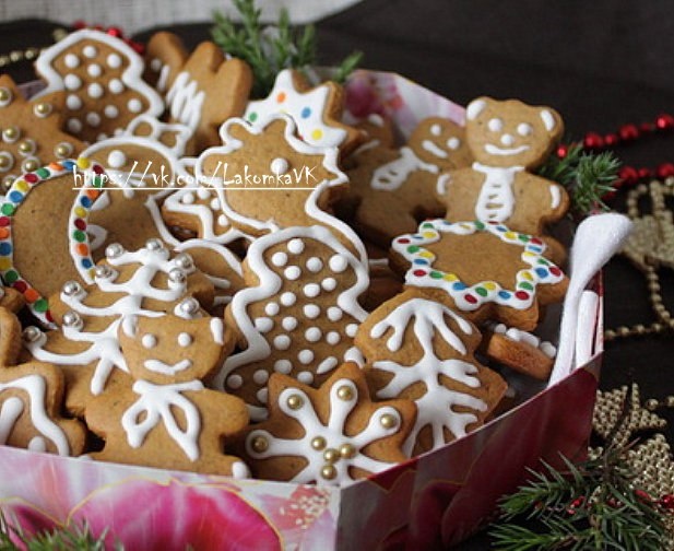 Кладем в кастрюлю сахар, мед и все специи, доводим до кипения, снимаем с огня. Добавляем соду, размешиваем. Смесь должна сильно вспениться. Кладем в кастрюлю нарезанное кубиками масло и размешиваем, пока оно не растворится. Добавляем яйцо и муку, замешиваем пластичное тесто. Делим тесто пополам, одну часть заворачиваем в пленку и откладываем в сторону. Остальное тесто раскатываем в пласт толщиной 0,5 см и вырезаем формочками печенье. Группа LakomkaVK (проверенные рецепты). Если вы собираетесь вешать печенье на елку - перед выпеканием в каждой печеньке делаем отверстие для нитки или ленты. Кладем на... ==>>