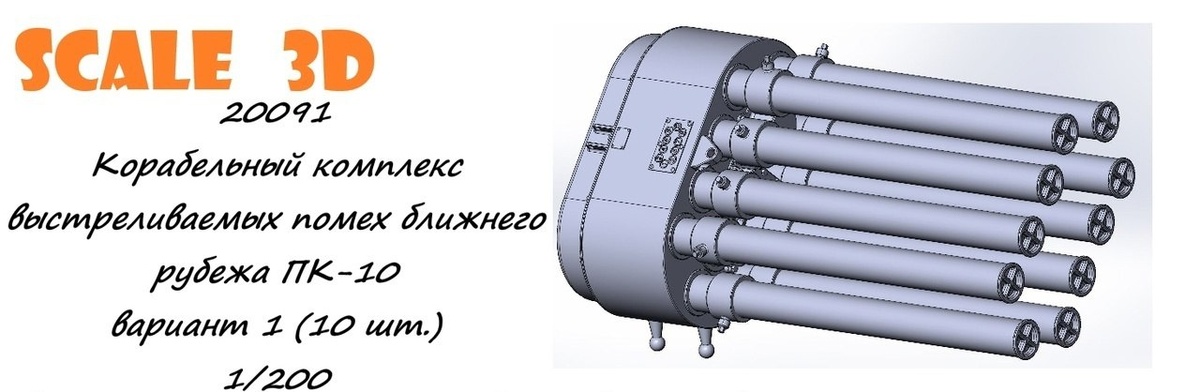 Новосибирская Scale_3D выпустила на 3D-принтере несколько вариантов модели корабельного комплекса выстреливаемых помех ближнего рубежа ПК-10 в масштабе 1/200 (по 10 шт. в каждом наборе):
