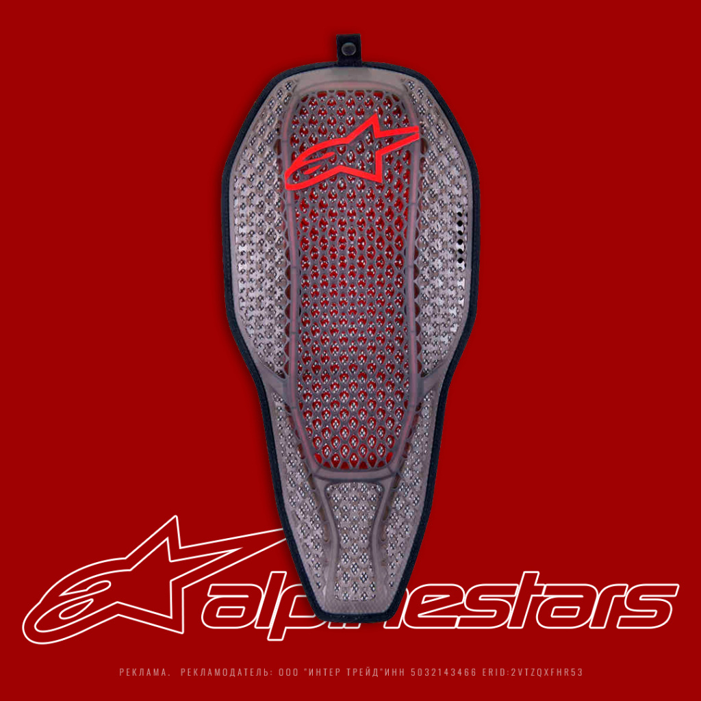 Это защитная вставка спины, дающая защиту от шеи до самого копчика. Благодаря одной хитрости, она может использоваться с куртками, у которых карман для щитка на спине сделан маленьким. У всех спортивных и туристических мотокурток Alpinestars, сделанных после 2022 года, есть карман на спине для защитной вставки. Даже не один, а два – как раз во второй можно нижним краем заправить эту длинную защиту Nucleon Flex Pro, а верхний её край зафиксировать хлястиком с кнопкой на петлю у воротника для подвешивания куртки в гардеробе. Так и получается защита от копчика и до шеи. Сама по себе защитная вставка тоже интересная – она сделана двухслойной и сотовой. Внешний слой из пластика, хорошо распределяющего точечный удар на большую площадь, а внутренний мягкий сминаемый, адсорбирующий энергию удара при деформации, в результате получился второй уровень защиты стандарта EN 1621-2:2014 Level 2, да ещё и с сертификацией T+/T-, что позволяет использовать её на морозе, для езды на снегоходах, к примеру