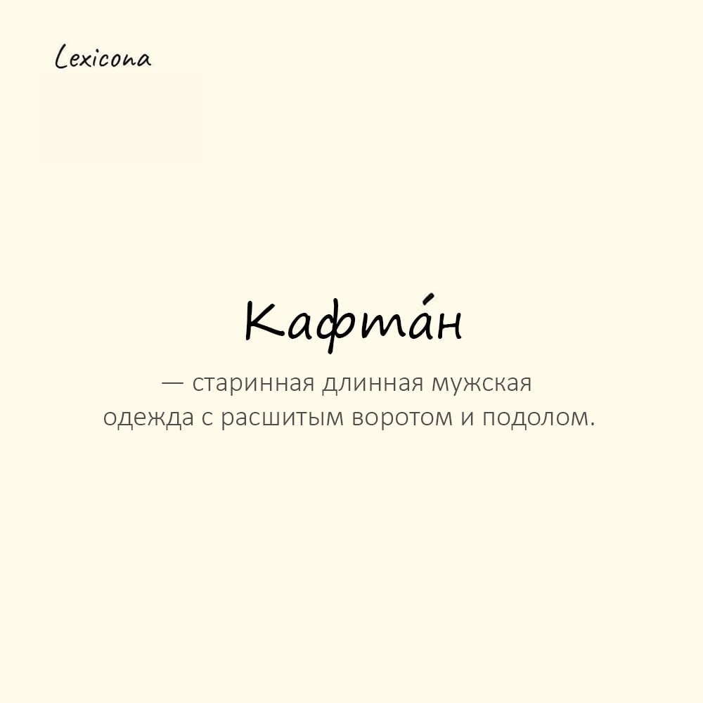 Кафтан — старинная длинная мужская одежда с расшитым воротом и подолом Пример употребления: На ярмарке купец в бархатном кафта́не торговал пряностями.