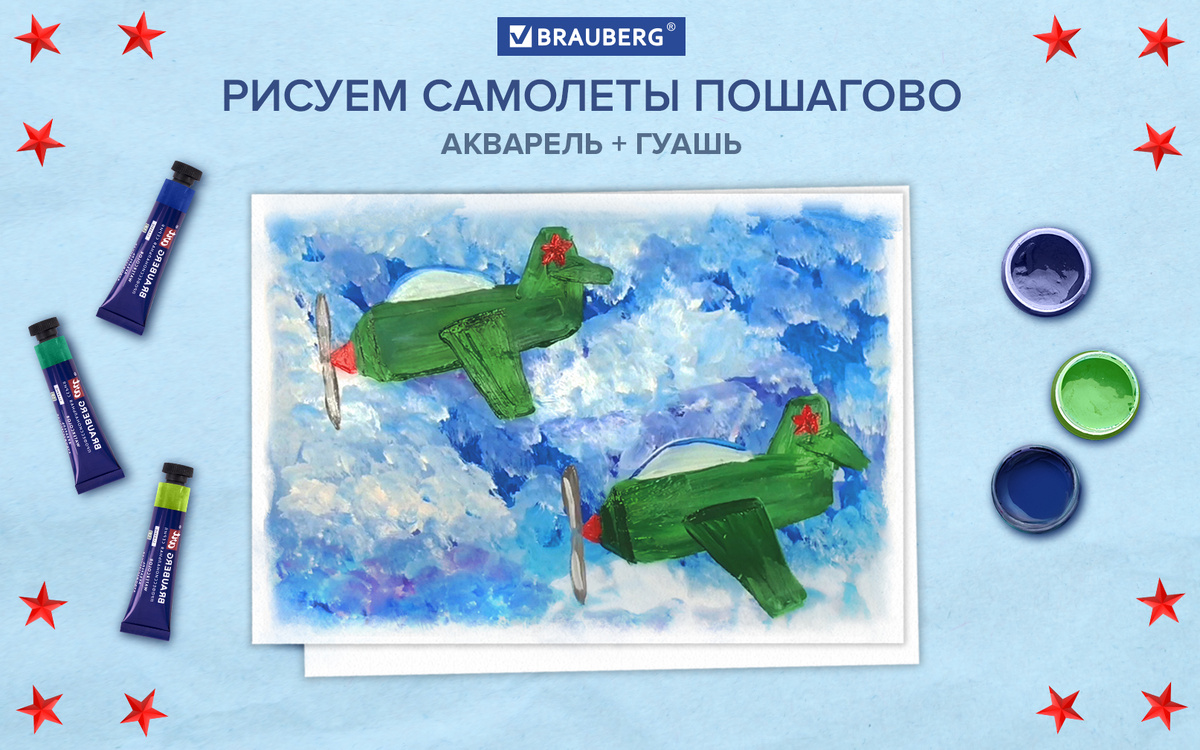 Что нарисовать с ребёнком ко Дню России? Предлагаем сделать такие несложные самолёты. Рисовать будем сразу гуашью и акварелью, поэтому советуем выбрать специальную плотную бумагу. ШАГ 1 Для начала сделаем фон с помощью акварели. Чтобы создать лёгкий воздушный эффект, используйте краску и большое количество воды. Чередуя синий и голубой цвет получим красивый градиент. ШАГ 2 Когда фон полностью заполнен, переходим к облакам. В этот раз возьмём гуашь. Набираем краску на кисть и точечными движениями намечаем будущее тучки. ШАГ 3 Чтобы сделать облака более пушистыми и мягкими, добавим белила. Снова точечными движениями заполняем пространство. Далее можно добавить немного фиолетовой краски. ШАГ 4 Переходим к самолётам. Рисуем сразу краской, поэтому внимательно и аккуратно повторяем шаги на картинке. Не забудьте рассчитать место так, чтобы уместить оба самолёта. В конце дополнительно подводим контур у крыла и хвоста. ШАГ 5 Теперь добавим детали. Белой краской нарисуем скруглённую кабину пилот