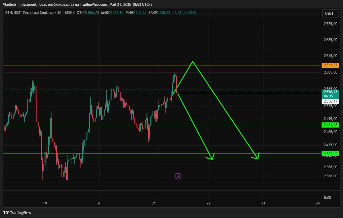 В ответ на пост По #ETH вверху собрали всю ликву, но небольшая часть еще осталась в районе 2622, туда и кину лимитку еще на добор шорта. Дальше жду снижение и сбор ликвида внизу, ну или с текущих пойдем вниз