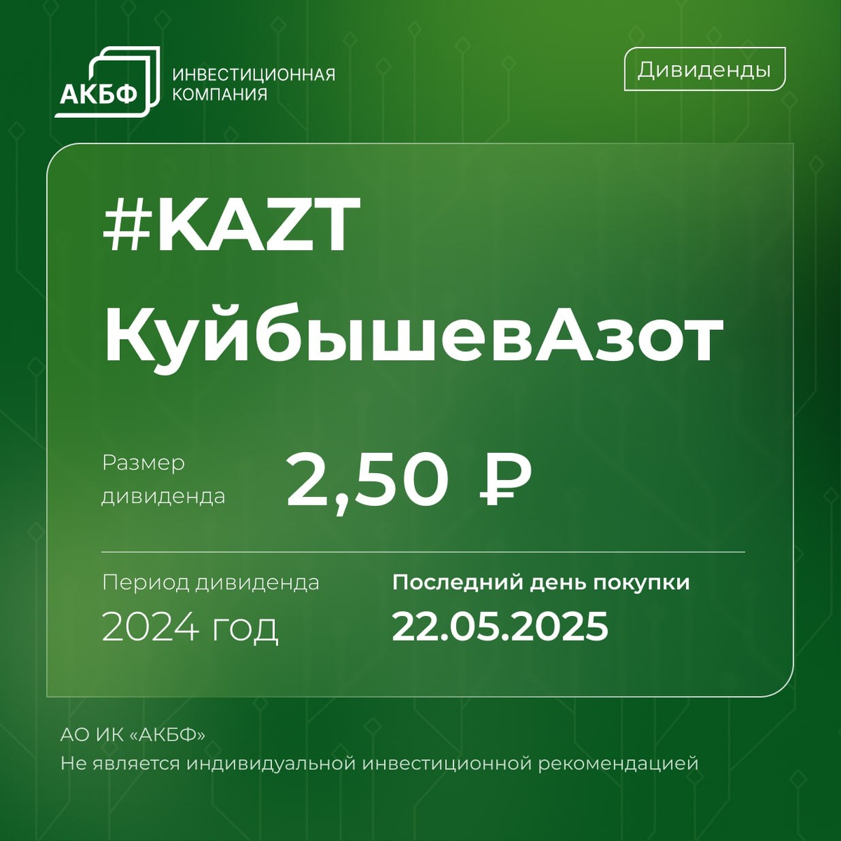 🗓 Календарь дивидендов 26 мая КуйбышевАзот завершит процесс закрытия реестра для начисления дивидендов за 2024 год. Размер дивидендов составит 2,50₽ на обыкновенную и привилегированную акцию. Чтобы попасть в реестр и получить выплату, необходимо приобрести акции не позднее 22 мая. Следите за дивидендами на сайте АКБФ 💸 #КалендарьДивидендов #инвестиции #КуйбышевАзот #KAZT #KAZTP #акции