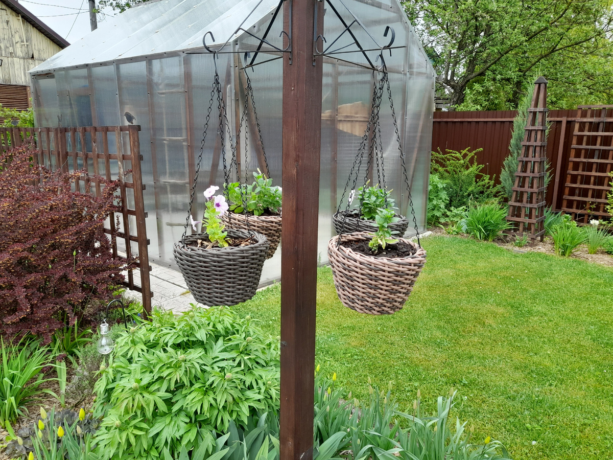 Дождались мы потепления и морозов больше не будет. Пора все выносить из укрытий и высаживать теплолюбивые растения. Вынесла и развесила петунии. Несколько петуний не пережили передержку, заменила. Хорошо, что черенковала с запасом. Одна пеларгония обожглась морозом и засохла, тоже подсадила. У нас новый ящик для пеларгоний на пять горшков. Ящики с горшками мне нравятся больше, чем с землей. Легко заменить растения и перенести ящик с места на место. Да и прослужат они дольше. Хосты, которые были в теплице просто красотки. Уже все в листве, сочные и яркие. Посадила колеусы. На своем месте сейчас декоративный огород. Томатам и перцам уже ничего не угрожает. Один томат начал цвести. Омолодила землянику Тоскана. За три года она заняла весь горшок и уже плохо развивалась. На улице оказались клематисы в кашпо. Это клематисы второй группы обрезки. Побеги зимой у них перезимовали и я жду фееричного махрового цветения. Бутонов много, в ближайшее время начнут распускаться. Пока не