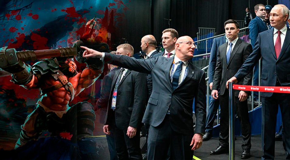 Вице-премьер Дмитрий Чернышенко тыкает пальцем в компьютерную игру Dota 2, водя президента по киберспортивным турнирам.