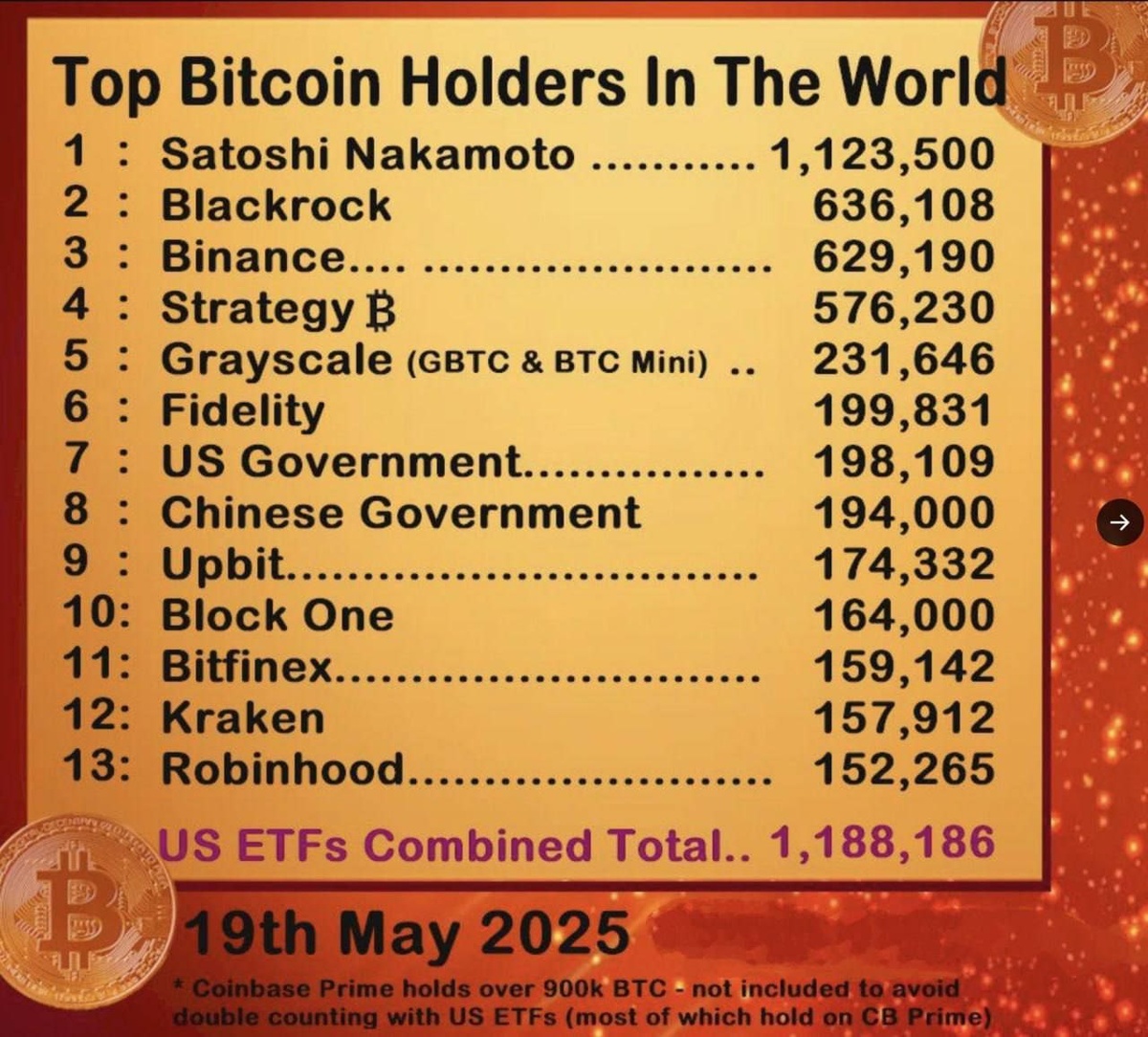 BlackRock обошел Binance и стал вторым крупнейшим держателем BTC после Сатоши Накамото BlackRock на 57% пути к тому, чтобы стать крупнейшим в мире держателем битка Вероятно это произойдет к концу следующего лета. Однако если биткоин достигнет $150 тыс. в течение следующих нескольких месяцев, мы, возможно, увидим ажиотаж со стороны советников, что значительно сократит сроки.