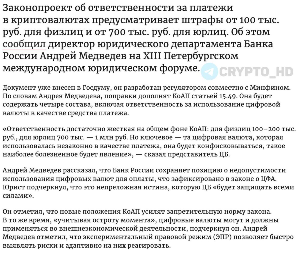В инфополе прошла новость: Банк России и Минфин внесли законопроект о штрафах за расчёты в криптовалюте.