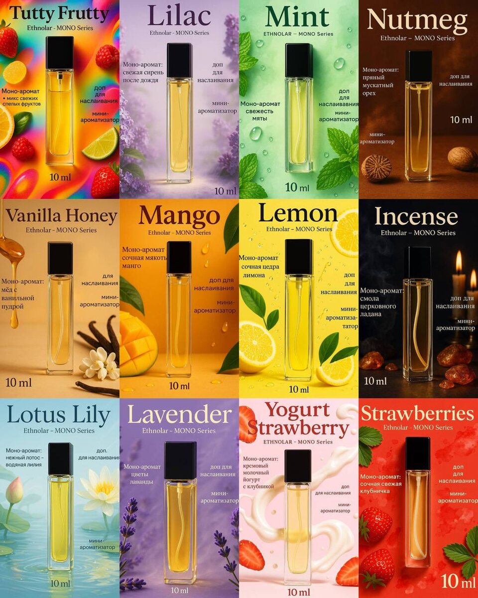 Всем 🌟🌟🌟! 😊 В Ethnolar в наличии новые моноароматы 🤩Choco - темный шоколад 🤩Арт. 420968241 🤩Apple Cinnamon - карамельные яблочки с корицей 🤩Арт. 420968243 🤩Grass - микс свежей травы с цитрусами 🤩Арт. 420968239 🤩Apple - кисло-сладкое наливное яблочко 🤩Арт. 420968242 🤩Tutty Frutty - микс свежих спелых фруктов 🤩Арт. 420968238 🤩Chypre - цветочный шипр 🤩Арт. 420968240 🤩Strawberry - сочная свежая клубника 🤩Арт. 420968228 🤩Mint - свежесть мяты 🤩Арт. 420968236 🤩Lilac - свежая сирень после дождя 🤩Арт. 420968237 🤩Nutmeg - пряный мускатный орех 🤩Арт. 420968235 🤩Watermelon - ломтики сочного арбуза 🤩Арт. 420968222 🤩Bubble Gum - жевательная резинка 🤩Арт. 420968225 🤩Vetiver - сухой пыльный землистый ветивер 🤩Арт. 420968223 🤩Lemon - сочная цедра лимона 🤩Арт. 420968232 🤩Mango - сочная мякоть манго 🤩Арт. 420968233 🤩Moccachino - молочный кофе с шоколадом 🤩Арт. 420968226 🤩Hibiscus Tea - зерна граната с чаем каркадэ 🤩Арт. 420968224 🤩Acacia - лепест