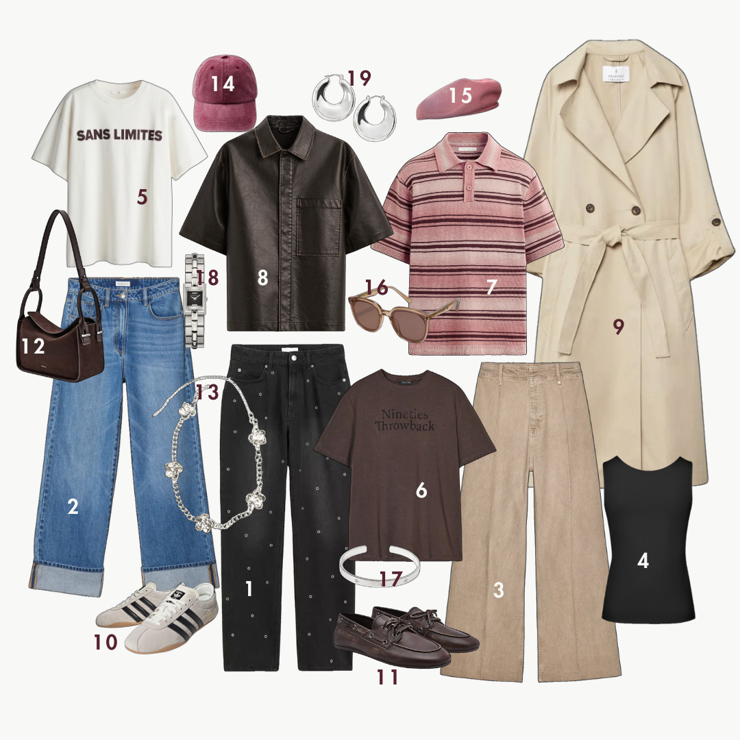 Как видите, все вещи в капсуле сочетаются между собой. Из них можно собирать самые разные комбинации. При этом вещи в комплект к джинсам на самом деле очень базовые и спокойные: черный топ, бежевый тренч, поло, футболки. Ничего сверхъестественного. Фактически это показывает, что любые базовые джинсы можно просто заменить на декоративные при желании.