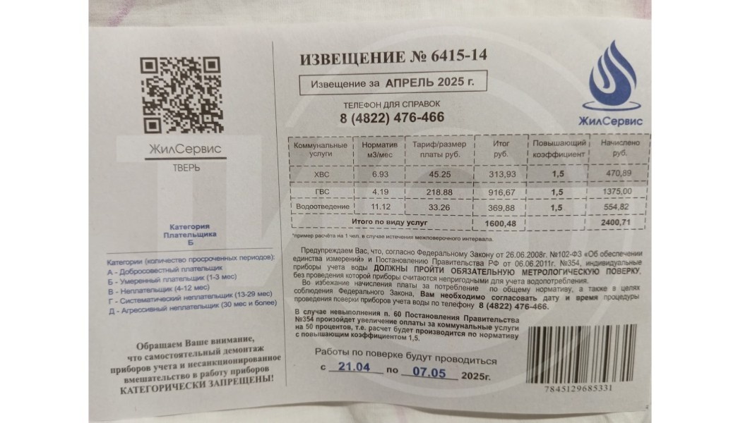 Жители Твери вновь начали находить в своих почтовых ящиках подозрительные извещения о якобы срочной поверке счётчиков на воду. Фотографию такой квитанции в редакцию ТИА прислал наш читатель. По внешнему виду они напоминают привычные квитанции за ЖКУ: есть и штрих-код, и QR-код, и сумма оплаты. В качестве отправителя указана некая организация "Жилсервис Тверь". Составители этих листовок ссылаются на Федеральный закон №102-ФЗ "Об обеспечении единства измерений" и пугают граждан начислениями по нормативу, если они не пройдут поверку счётчиков. Также в извещении указаны сроки "обязательных работ". Однако на деле этот документ — подделка. Указанные в нём нормативы расхода воды не соответствуют установленным в Тверской области, а штрих-код на оплату ведёт... в Парагвай. QR-код открывает кустарно оформленный сайт с псевдоэкспертными статьями, написанными неофициальным языком. На сайте нет ни лицензии, ни ИНН, ни другой информации, подтверждающей легальность услуг. Название "Жилсервис Тверь" т