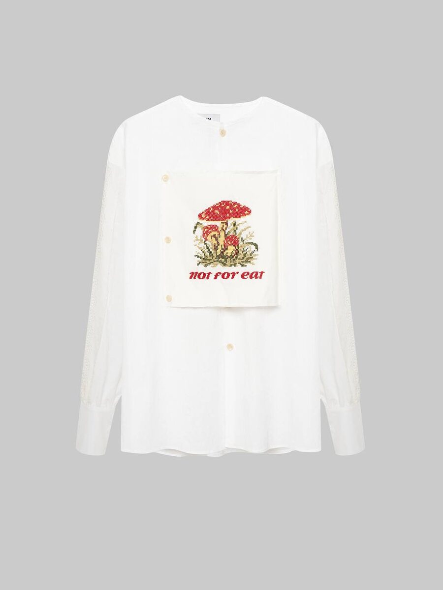 Рубашка RomaUvarovDesign x ODOR из вареного хлопка с винтажной кружевной тесьмой на рукавах и нагрудной застежкой с вышивкой гриба