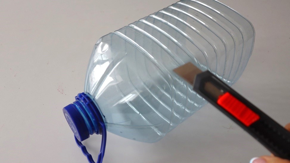 Берём пятилитровую пластиковую бутылку и разрезаем её пополам. Нам понадобится только верхняя часть — та, где горлышко. Берём паяльник или раскалённый на огне гвоздь и прожигаем отверстия по всей поверхности бутылки. Отверстия должны быть примерно по 1 сантиметру в диаметре, а расстояние между ними – окол