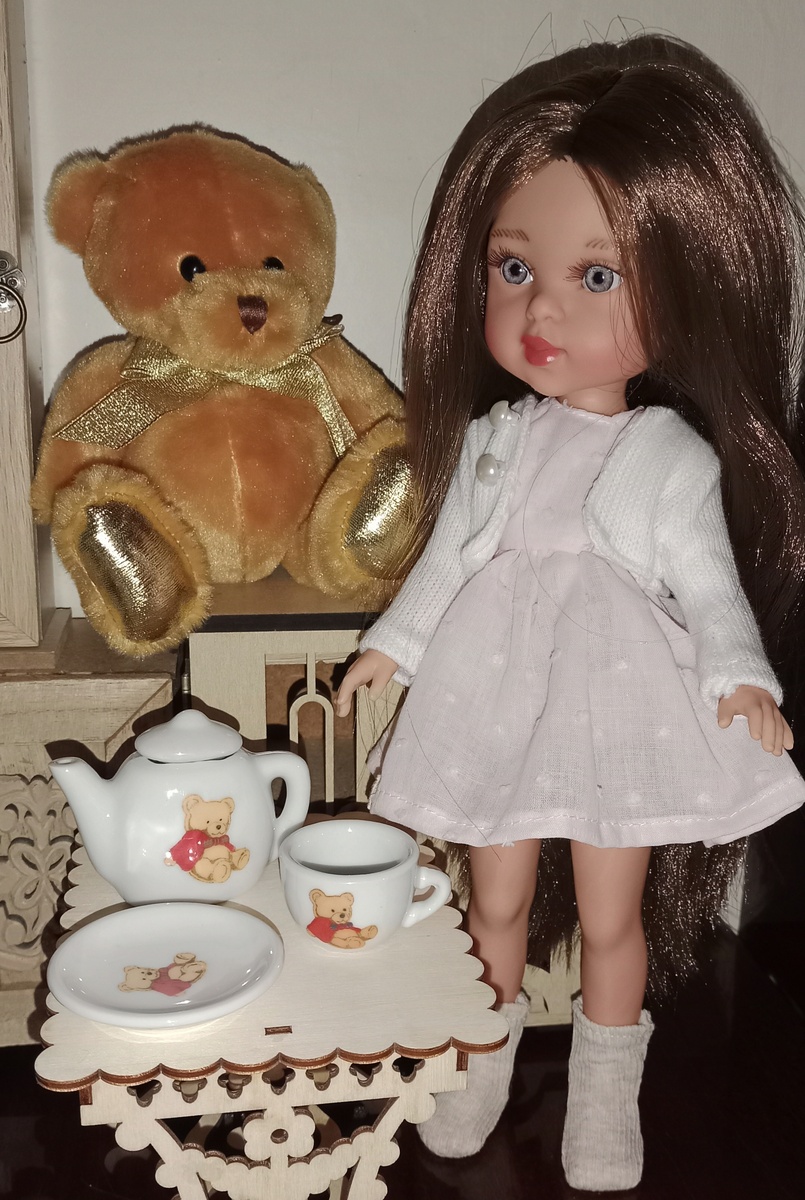 Когда я видела фото новинки, я задумалась. Уж очень она мне показалась похожа на новинку от Arias и Paola Reina. Но все же решила приобрести. Пусть будет сестрёнка. Но уже когда куколка была в пути, я просмотрела ролик-сравнение Пенелопы с новым молдом Паолки. Может и похожи, но не очень. И вот я увидела эту красавицу. Ни одна фотография не передаёт красоту, миловидность и очарование этой куклы. Ее не хочется выпускать из рук. Ей, как и Паолкам, подходит любая одежда, любой образ. Когда я сравнила ее с новинкой Ариас Элегант, оказалось, что они похожи только в плоском изображении на фотографии, и то не очень сильно, а в жизни - совсем разные куколки. Но вполне подружки. С Паолками куколка тоже может дружить, хотя пропорции несколько разные. Пенелопа более худенькая, а головка крупнее. Паолки выше ростом, чем Пенелопа, и винил у них желтеет со временем. В целом могу сказать, что куколка чудесная. Густые волосы немного ниже колен. Идеальны для причёсок. Прошивка хорошая. Куколка оче