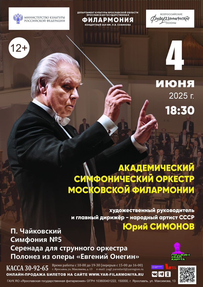 Дорогие слушатели! Есть несколько билетов на выступление выдающегося коллектива, который уже не первый год становятся кульминацией филармонического сезона в Ярославле, неизменно собирая полные залы и вызывая восторг у слушателей. 4 июня 2025 года в 18:30 в рамках программы Министерства культуры Российской Федерации «Всероссийские филармонические сезоны» выступит Академический симфонический оркестр Московской филармонии – коллектив, который по праву занимает одно из ведущих мест в мировом симфоническом искусстве. Под управлением народного артиста СССР Юрия Симонова, одного из самых авторитетных дирижёров современности, оркестр представит программу, посвящённую гению русской музыки – Петру Ильичу Чайковскому. Выбор программы не случаен - в 2025 году музыкальный мир отмечает 185 лет со дня рождения великого русского композитора. Билеты 👉 https://clck.ru/3JS5Fu Молодые люди могут сходить на концерты по «Пушкинской карте» в рамках национального проекта «Семья» https://yar-filarmoniya.ru/