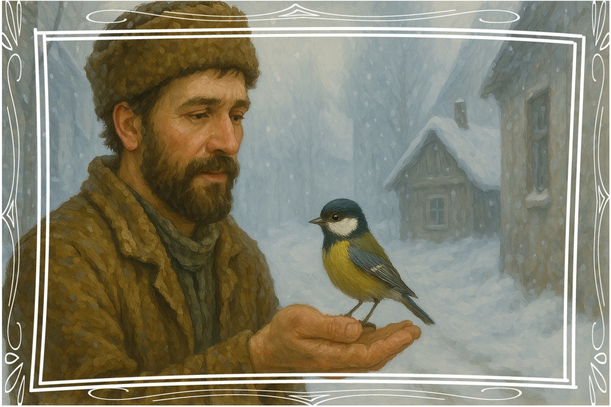 Мужичок удивился человеческой речи и решил прислушаться к словам птицы. Он бережно взял птичку в огрубевшие, замёрзшие ладони, подышал на неё и сунул за пазуху.