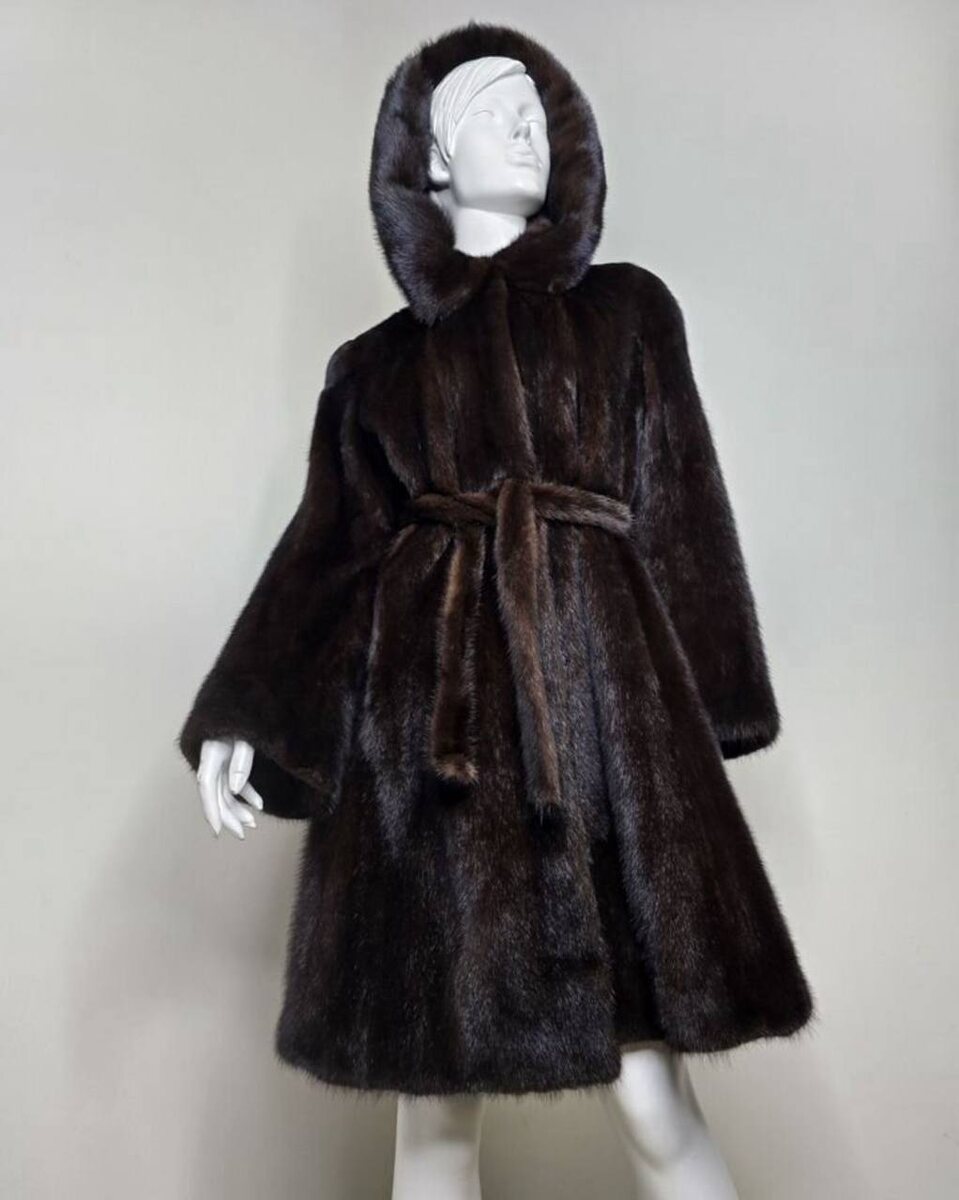 Утончённая шубка-платье из натуральной норки с капюшоном и стильным меховым кушаком на талии. Шубка не новая, но в отличном виде – без потёртостей и дефектов.👌