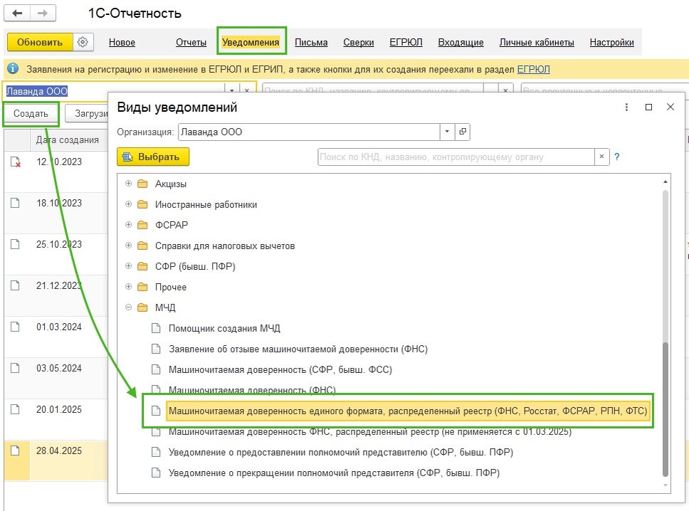 Какую МЧД нужно сделать для загрузки данных из ЛК ЕНС? 🤔 Загрузка данных из ЛК ЕНС очень удобна и многие уже ей пользуются. Но сегодняшний пост для тех, кто только собирается настроить интеграцию с ЛК ЕНС в 1С 🚀 Отвечаем на вопрос: Какая МЧД нужна для настройки загрузки данных из ЛК ЕНС в 1С? Действительно, если зайти в раздел Отчеты – Уведомления – Создать – МЧД, то мы увидим большой список разных вариантов машиночитаемых доверенностей. Для ЛК ЕНС подходит МЧД Единого формата, распределенный реестр. И в ней должны быть добавлены полномочия МЧД ФНС. Также доверенность должна быть зарегистрирована в распределенном реестре. Если у вас уже есть МЧД, но по каким-то из параметров она не подходит, например, не хватает полномочий, то вам необходимо зарегистрировать новую МЧД, так как в уже зарегистрированную внести изменения и дополнения нельзя.