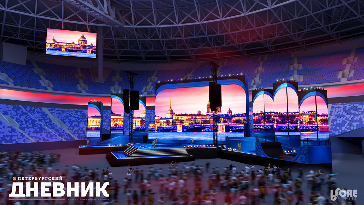 Сцена на фестивале будет иметь размеры 30 на 60 метров, а за ней разместятся конструкции и башни с экранами общей площадью более 1100 квадратных метров. Высота сцены составит около 2 метров.